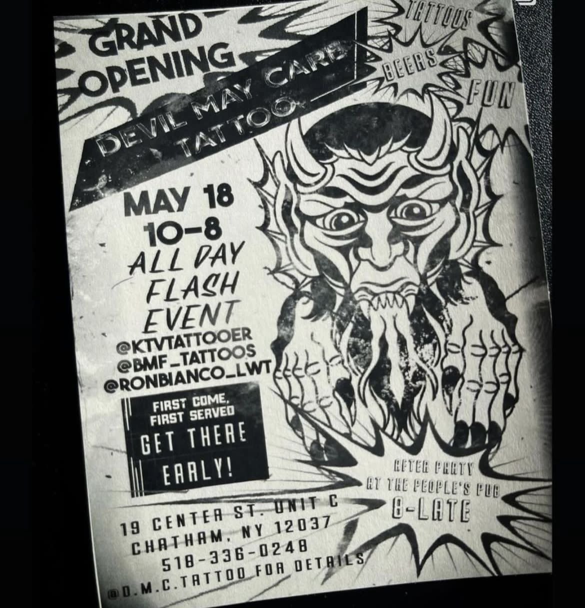 collaboration with devil may care tattoo shop in Chatham, ny for their grand opening. this was a really fun project to work on . I used my illustration style to create a tee shirt design that reflects the fun and funky style of the dmc shop.