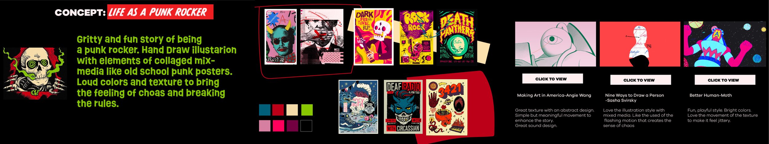 I started by creating my own concept. I was inspired by the punk scene and how music can help let you break free and be yourself. I included a mood board and some examples of animations I was also inspired by.